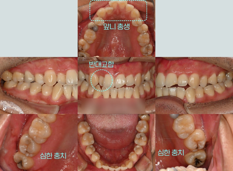 삐뚤어진 치열 그리고 심하게 썩은 이로