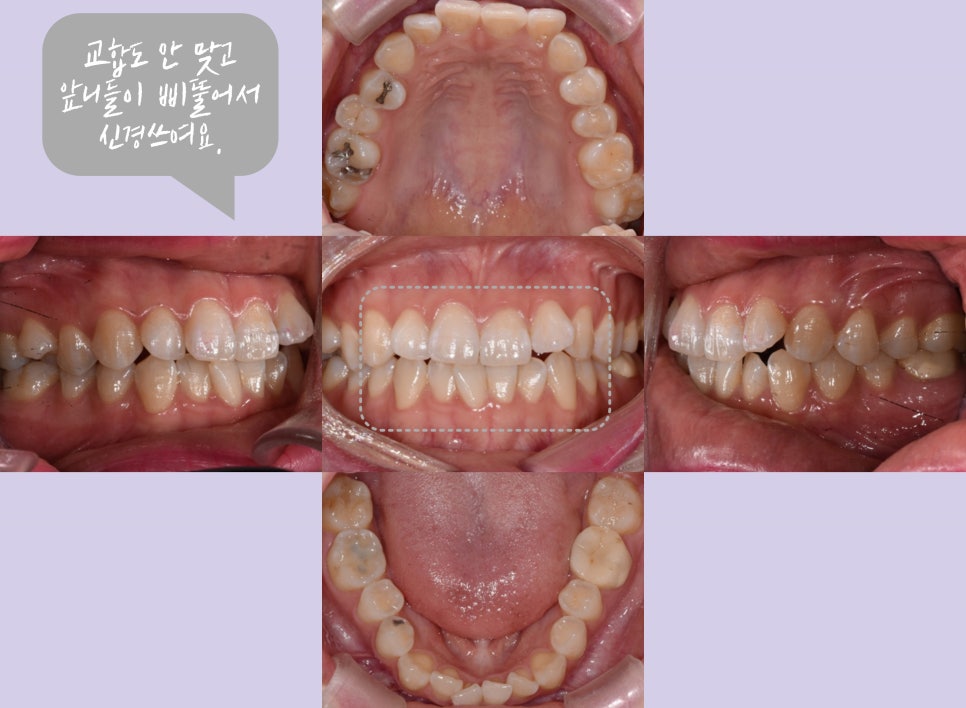 심하진 않지만 틀어지고 뻐드러져 있는 치아로,